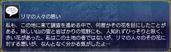 私も、この地に来て調査を進める中で、何度かその花を目にしたことがある。険しい山の雪と岩ばかりの荒野にも、人知れずひっそりと咲く、赤い花があった。私はこの土地の者ではないが、リマの人々のその花に対する想いが、なんとなく分かる気がしたよ…