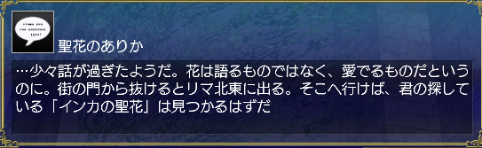 …少々話が過ぎたようだ。花は語るものではなく、愛でるものだというのに。街の門から抜けるとリマ北東に出る。そこへ行けば、君の探している「インカの聖花」はみつかるはずだ