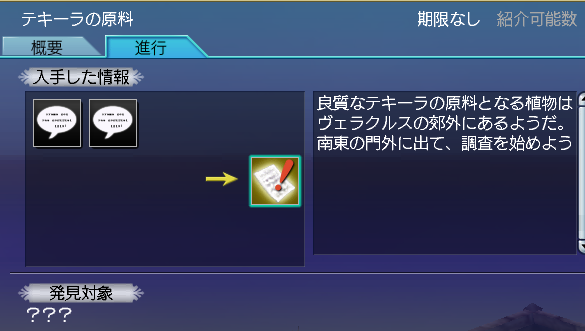 テキーラは、ある植物の根を蒸留して造るんだ。ウチの店でも取り扱ってるんだが、もっといい味のテキーラを用意できれば売り上げが増えるんじゃないかと思ってね。ヴェラクルスの交易所の親父がテキーラにくわしいそうだから、良質な原料の情報を持ってるかもしれないな