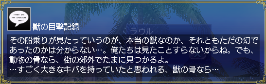ポルトベロに滞在していた船乗りが顔色を悪くして依頼してきたんだが聞くか? なんでも、ポルトベロの郊外でとんでもなくキバのデカい獣を見たらしいんだ。でもふっと消えてしまったらしくてな…。最近は夢にまで見るそうだ。幻覚か実在しているのか、ポルトベロで確かめてくれ