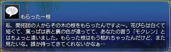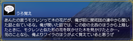 前提クエは「花の涙」(発見物:モクレン)で、このクエのNPCはそういえば個人的に嫌いなタイプの人なのでクエ読み返さなければよかったーということを思い出した…。説教くさくて自分語りしすぎで自分に酔ってる感じが苦手w