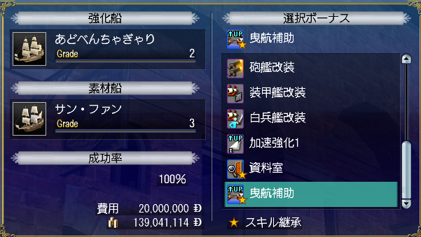 - リビルド…①探査船改装(サルベ引き上げ率up)、③スキル継承(曳航補助←サンフアン※スキル枠に入らない)