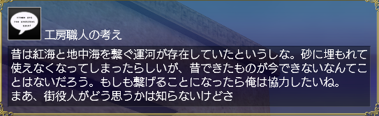 昔は紅海と地中海を繋ぐ運河が存在していたというしな。砂に埋れて使えなくなってしまったらしいが、昔できたものが今できないなんてことはないだろう。もしも繋げることになったら俺は協力したいね。まあ、街役人がどう思うかは知らないけどさ