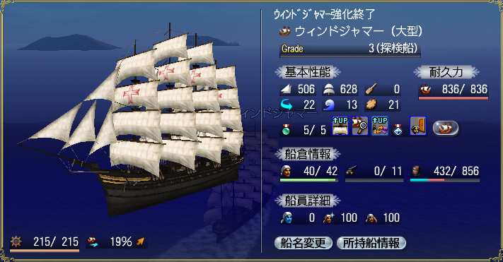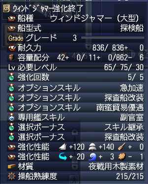 - 5/5(G3)……完成(縦帆、横帆→max、旋回→max-3、オプションスキル→急加速、南蛮貿易優遇、探査船改装、専用艦スキル→副官室、型→探検船)