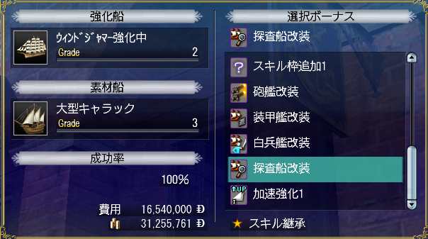 探査船改装……洋上の経験値10%upが欲しかったし、オプションスキル数確保と強化はスキル付与ではなく数値強化にあてたかったのと。