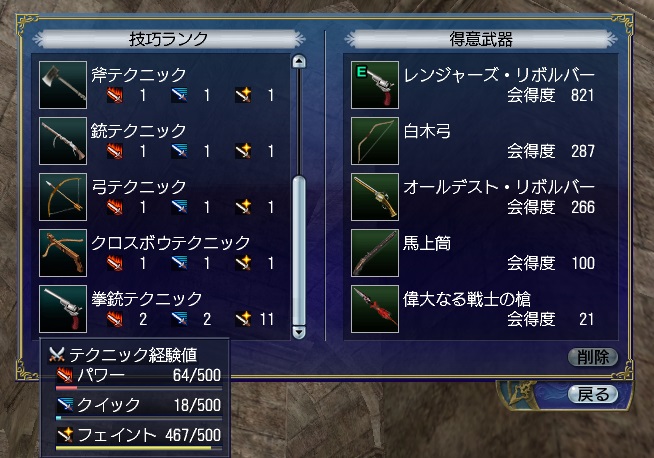 武器は、攻撃60の拳銃。会得度は820くらいにはなってる(ミッションクリアで会得度あがってるけど)。